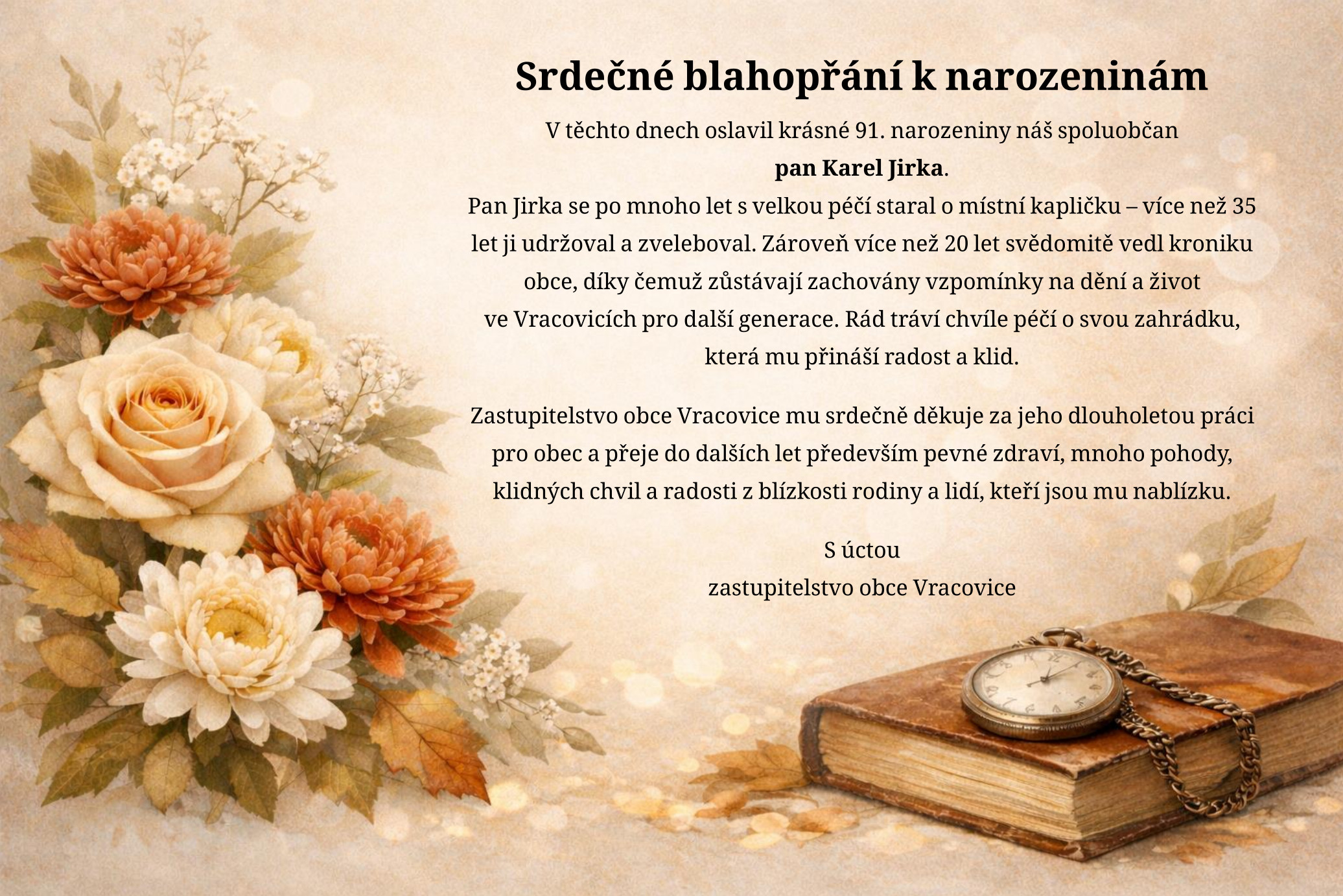 Zastupitelé obce Vracovice jí srdečně gratulují a přejí do dalších let především pevné zdraví, mnoho radosti, spokojenosti a lásky jejích blízkých.
