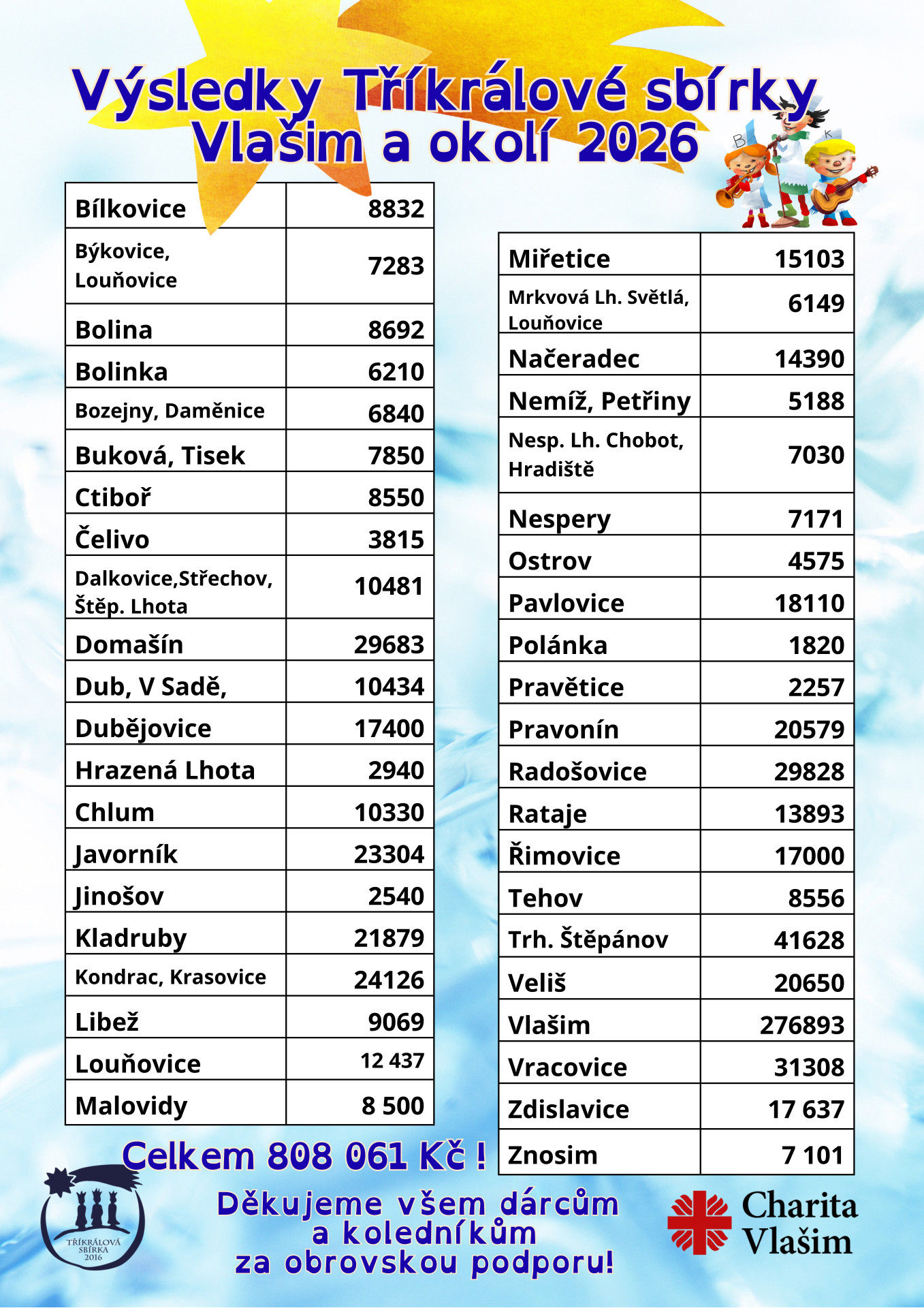 s upřímnou radostí a vděčností Vás informujeme o výsledku Tříkrálové sbírky 2026 ve Vlašimi a širokém okolí.