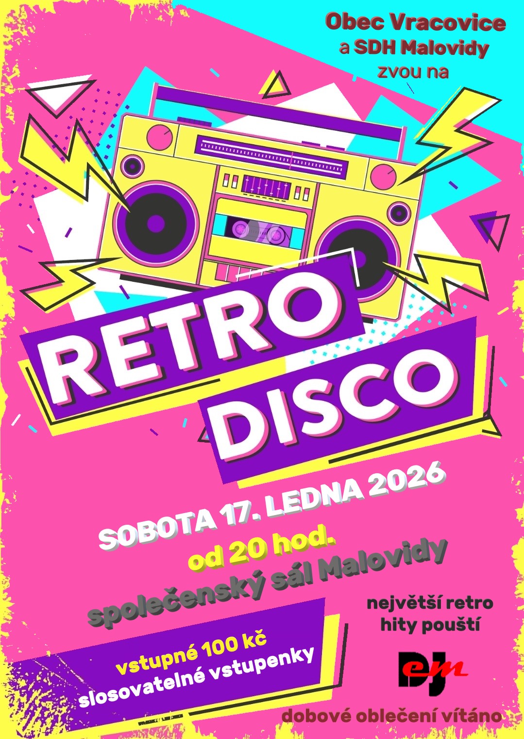 Obec Vracovice a SDH Malovidy Vás zvou na retro disko, které se koná v sobotu 17. ledna 2026 od 20. hod. ve společenském sále v Malovidech. Vstupné je 100 Kč a vstupenky jsou slosovatelné. Největší retro hity zahraje DJ eM. Dobové oblečení je vítáno!